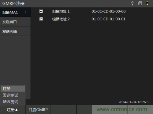 GMRP模塊在DT6000E設備總共分為注冊、發送測試和接收測試頁面。