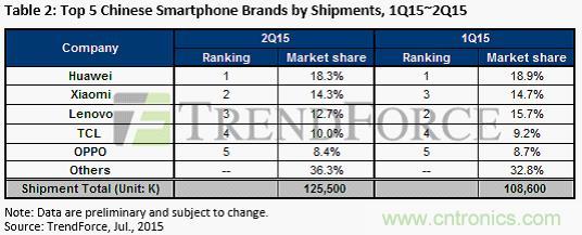 【導(dǎo)讀】近日,市場研究機構(gòu)TrendForce發(fā)布2015年度第二季度全球智能手機報告。中國的華為明顯獨領(lǐng)風(fēng)騷。數(shù)據(jù)顯示,三星雖然從蘋果手里奪回第一的寶座,但是,Q1和Q2 幾乎毫無變化。蘋果的市場份額則一調(diào)再掉,從Q1的20.5%掉到Q2的15.4%。華為的市場份額增加了7%,小米的份額增加了5%。
