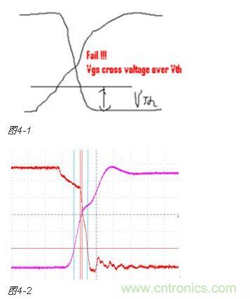 下面這種情況有非常多的人會忽視,甚至是一些比較有經驗的電源測試工程師。下面組圖四是下管打開,上管關閉時候的波形(圖4-1是示意圖,圖4-2示實際測試圖)。雖然沒有被同時帶起的情況,但是請注意上下管有交叉的現象,而且交叉點的電平遠高于MOS管規定的Vth值,這是個嚴重的shoot through現象。最直接的后果就是MOS管燒毀!