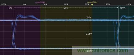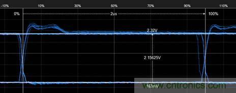 4. 然后再測(cè)量bit后半段的最大幅值,如圖5所示,為2.25V。則2.25÷2.15=104%,符合GMW3122信號(hào)特征標(biāo)準(zhǔn)。