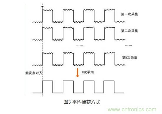 第三個就是平均捕獲模式了,這個名字也非常容易理解,就是采集N屏信號,將它們在觸發(fā)位置對其,然后做平均運(yùn)算。