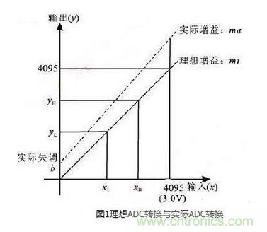 對(duì)于雙極性輸入,其0 V輸入的增益誤差對(duì)應(yīng)單極性輸入的1.4315V的增益誤差,因此,原有ADC的增益誤差和失調(diào)誤差被增大了。例如,如果ADC的增益誤差為5%,失調(diào)誤差為2%,則其雙極性的增益誤差計(jì)算如下:雙極性輸入x′= 0.0000 V,單極性的ADC輸入電壓x = 1.4315 V,其理想的轉(zhuǎn)換值為ye=1.4315×4095/3=1954,而由ya=1954×1.05+80計(jì)算得實(shí)際轉(zhuǎn)換值,則雙極性增益誤差為ya-ye=2132-1954=178(9.1%誤差)。通過計(jì)算可以看出,ADC的誤差大大增加,因此要使用ADC進(jìn)行數(shù)據(jù)采集,就必須對(duì)ADC進(jìn)行校正,提高其轉(zhuǎn)換精度。
