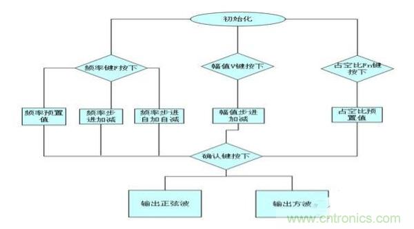 本系統要求在給定±15V電源電壓條件下設計出一個能產生正波和脈沖波的信號源。信號頻率為20Hz~20kHz,頻率能程控步進調整(步長為5Hz),脈沖波的占空比在2%~98%之間能程控步進調整(步長2%),兩路信號均要求幅值在100mv到3V步進可調(步長為100mv),要求性能良好(頻率穩度高,非線性失真小等),方案考慮如下: