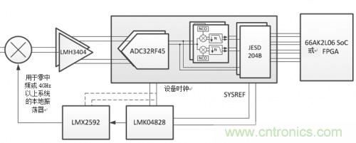 在射頻采樣無線電中,采樣時鐘的質量好壞對系統產生的信噪比(SNR)具有強烈影響。LMK04828是兼容JESD204B的超低噪音時鐘抖動清除器,可生成小于100fs抖動、具有射頻采樣能力的時鐘,同時具有一系列收縮或簡化系統的特性。因支持最多七個JESD204B裝置,LMK04828可以為多個ADC32RF45 ADC、數字模擬轉換器(DAC)、FPGA或DSP記時。LMK04828還可以生成系統參考(SYSREF)信號,用于JESD204B系統中確定性延遲,而數字和模擬延遲可幫助滿足每個JESD204B設備的關鍵計時需求。