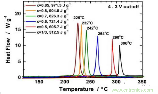 而且隨著NCM能量密度的不斷提高,材料的熱穩定性會越來越差。下圖表述的是隨著Ni含量的升高材料的分解溫度逐漸下降。