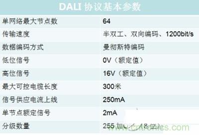 DALI數字式可尋址燈光接口(Digital Addressable LighTIng Interface)鎮流器是當前最新的可調光熒光燈鎮流器。DALI是一個數據傳輸的協議,它定義了電子鎮流器與設備控制器之間的通信方式,基于DALI 協議組建的系統具有分布式智能模塊, 各個智能化DALI 模塊都具有數字控制和數字通信能力, 地址和燈光場景信息等都存儲于各個DALI 模塊的存儲器內。DALI 模塊通過DALI 總線進行數字通信、傳遞指令和狀態信息,實現燈的開關、調光控制、系統的設置等功能。DALI總線制定一個系統結構簡單、安裝方便、操作容易、功能良優的燈光控制系統,可用于一個房間內的燈光控制,還可以連接更高級的設備網絡,如以太網,以支持更多的設備和足夠的網絡帶寬。 DALI協議的基本參數如下: