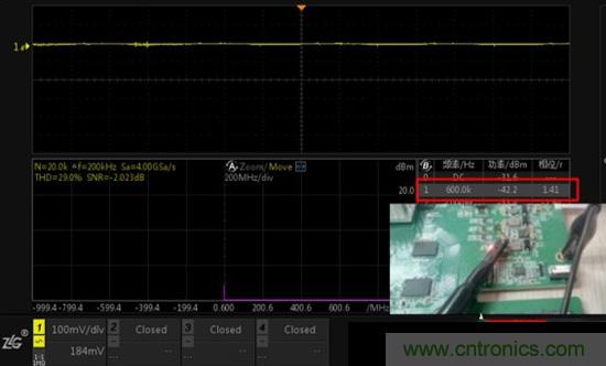 注:通道1信號(hào)幅度雖然非常小,但通過FFT分析還是可以定位出600K頻點(diǎn)的干擾。