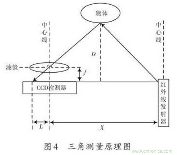 紅外感應(yīng)器包含紅外發(fā)射器與CCD檢測(cè)器,紅外線發(fā)射器會(huì)發(fā)射紅外線,紅外線在物體上會(huì)發(fā)生反射,反射的光線被CCD檢測(cè)器接收之后,由于物體的距離D不同,反射角度也會(huì)不同,不同的反射角度會(huì)產(chǎn)生不同的偏移值L,知道了這些數(shù)據(jù)再經(jīng)過(guò)計(jì)算,就能得出物體的距離了,如下圖所示。