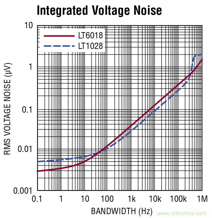 圖 1:LT1028 和 LT6018 積分電壓噪聲