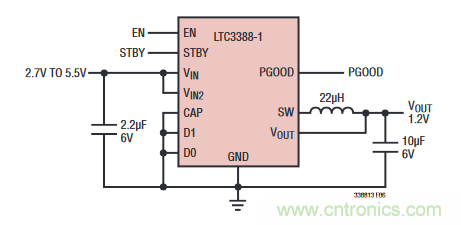 圖 1:簡便的 LTC3388-1 典型低壓應用電路