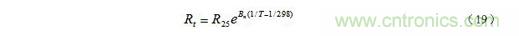 其中R25和Rt分別為25℃和t℃時熱敏電阻的阻值,T = 273 + t;Bn為材料常數,其值因制作時不同的處理方法而異,對確定的熱敏電阻,可以由實驗測得的電阻—溫度曲線求得。我們也可以把(19)式寫成比較簡單的表達式