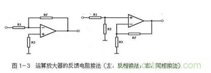 其次,由于放大倍數(shù)為無(wú)窮大,所以不能將運(yùn)算放大器直接用來(lái)做放大器用,必須要將輸出的信號(hào)反饋到反相輸入端(稱(chēng)為負(fù)反饋)來(lái)降低它的放大倍數(shù)。如圖1-3中左圖所示,R1的作用就是將輸出的信號(hào)返回到運(yùn)算放大器的反相輸入端,由于反相輸入端與輸出的電壓是相反的,所以會(huì)減小電路的放大倍數(shù),是一個(gè)負(fù)反饋電路,電阻Rf也叫做負(fù)反饋電阻。