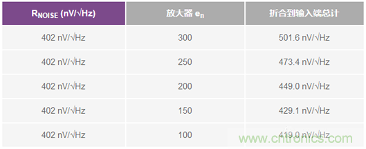 表2顯示了增加獨立信號源引起的噪聲增加。從402 nV/√Hz到502 nV/√Hz的變化按對數算只有1.9 dB,或0.96功率dB。運算放大器噪聲約為電阻噪聲的50%,運算放大器VNOISE的5%不確定性僅讓輸出噪聲密度改變1%。
