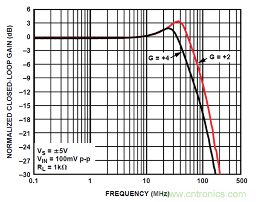 圖 1 所示增益可選放大器采用了一種創新的開關技術,可以保持 ADA4896-2 的 1 nV/√Hz噪聲性能,同時降低非線性增益誤差。利用這種技術,用戶可以選擇電容最小的開關來使電路的帶寬最大化。
