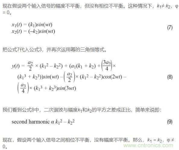 如果回過頭比較公式9和公式12,并且假設三角恒等式運用正確,那么可以得出如下結論:二次諧波受相位不平衡影響比受幅度不平衡影響更嚴重。原因如下:對于相位不平衡,二次諧波與k1的平方成正比;再看公式12,對于幅度不平衡,二次諧波與k1和k2的平方差成正比,或看公式9。由于k1和k2大致相等,因此這種差異通常很小,特別是如果將其與平方數進行比較!