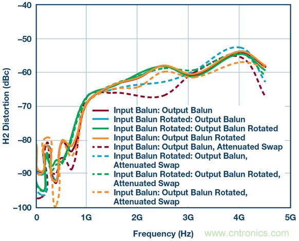 乍一看相當簡單,但魔鬼隱藏在細節中。圖3顯示了一組HD2測試結果,其系使用本框圖中的所有器件、差分放大器、巴倫、衰減器等得到的。這些測試證明:僅僅用不同方式翻轉巴倫方向所導致的細微相位不匹配,便能在HD2掃頻中產生不同結果。此設置中有兩個巴倫,因此通過顛倒設置一側或兩側的連接可以創建四種可能的場景。結果如圖3所示。