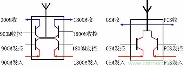 由于手機(jī)工作時(shí)接收和發(fā)射不能同時(shí)在一個(gè)時(shí)隙工作(即接收時(shí)不發(fā)射,發(fā)射時(shí)不接收)。因此后期新型手機(jī)把接收通路的兩開關(guān)去掉,只留兩個(gè)發(fā)射轉(zhuǎn)換開關(guān);接收切換任務(wù)交由高放管完成。