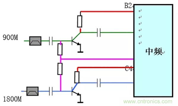 原理:a)、供電:900M/1800M兩個(gè)高放管的基極偏壓共用一路,由中頻同時(shí)路提供;而兩管的集電極的偏壓由中頻CPU根據(jù)手機(jī)的接收狀態(tài)命令中頻分兩路送出;其目的完成900M/1800M接收信號切換。
