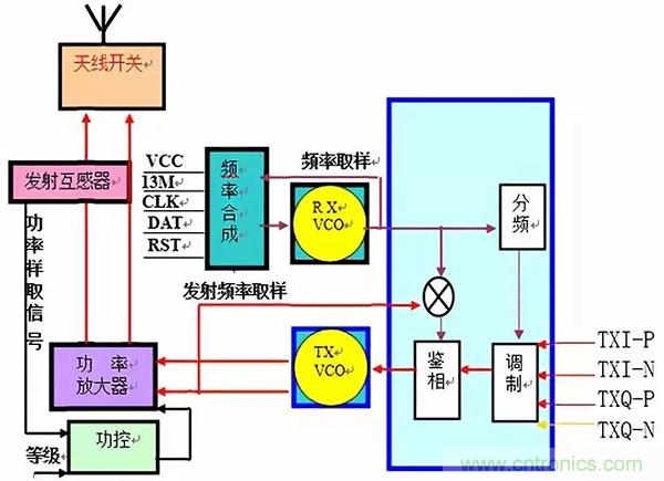 從上看出:由TX-VCO產(chǎn)生頻率到取樣送回中頻內(nèi)部,再產(chǎn)生電壓去控制TX-VCO工作;剛好形成一個(gè)閉合環(huán)路,且是控制頻率相位的,因此該電路也稱發(fā)射鎖相環(huán)電路。