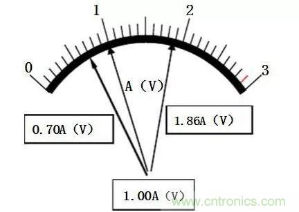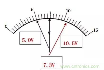 表盤(pán)的最小分度值為0.5V/格,雖能準(zhǔn)確讀到0.5V,但誤差仍出現(xiàn)在最小分度值的同一數(shù)位上,即以V為單位的十分位。其估讀法則是:將最小分度分為五等分,即為0.1V。