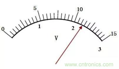 若是0~15V檔,最小分度值為0.5V, 半格為0.25V,通常可估讀為0.2V或0.3V。(因有效數(shù)字出現(xiàn)在以V為單位的十分位上)。圖中讀數(shù)應(yīng)為 11. 2V或11.3V。