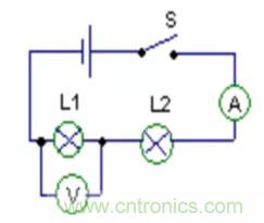 如圖所示,我們可以把電路圖分為兩部分:“和電壓表并聯(lián)部分”即L1和“并聯(lián)以外部分”——L2、電流表、開(kāi)關(guān)。
