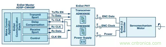 本文討論的EnDat接口是在ADI的ADSP-CM40x上實現,后者是一款針對電機控制驅動器而開發的處理器。除了脈寬調制器(PWM)定時器、模數轉換器(ADC)和sinc濾波器等用于電機控制的外設以外,ADSP-CM40x還有高度靈活的串行端口(SPORT)。