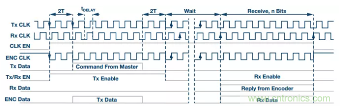 來自處理器的時鐘信號是連續的,而EnDat協議規定,時鐘只能在通信期間施加于編碼器。在所有其他時候,時鐘線路必須保持高電平。為此,處理器產生一個時鐘使能信號CLK EN,其被送至ADM3065E數據使能引腳。恰好兩個時鐘周期(2T)之后,主機開始在Tx DATA上發出命令。命令有6位長,隨后是兩個0位。為了控制收發器的數據方向,處理器在傳輸時將Tx/Rx EN位置1。
