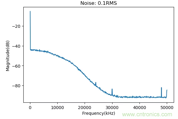 數(shù)字萬用表對于不同頻率正弦信號測量結果是不同的。由于隨機噪聲信號的頻譜擴展到了30Mhz左右,所以超過500kHz之后的頻率分量的結果都進行了衰減。