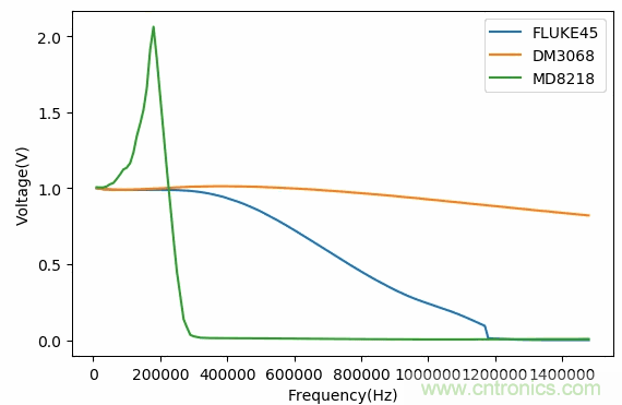由于萬用表各自的頻率曲線不同,所以所測量隨機噪聲有效值減少的比率也不同。下面是利用同樣的方法測量得到的FLUKE45, MD8218數(shù)字萬用表的頻率曲線。