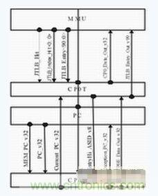 協(xié)助TLB進(jìn)行虛實(shí)地址轉(zhuǎn)換是CP0的主要功能之一。TLB屬于系統(tǒng)的特權(quán)資源,只有CP0有權(quán)對(duì)其進(jìn)行訪問,因此CP0與TLB之間的連線較多,數(shù)據(jù)交換的時(shí)延也比較關(guān)鍵。同時(shí),PC模塊與CP0的數(shù)據(jù)交換也非常重要。因此,CP0單元在版圖上最好同時(shí)靠近TLB和PC模塊。本設(shè)計(jì)將CP0中與TLB相關(guān)的邏輯與寄存器獨(dú)立為CP0T,放在MMU與PC模塊之間;CP0的其余部分歸為CP0E,放在PC下部,也就是整塊芯片的最下端。如下圖所示。