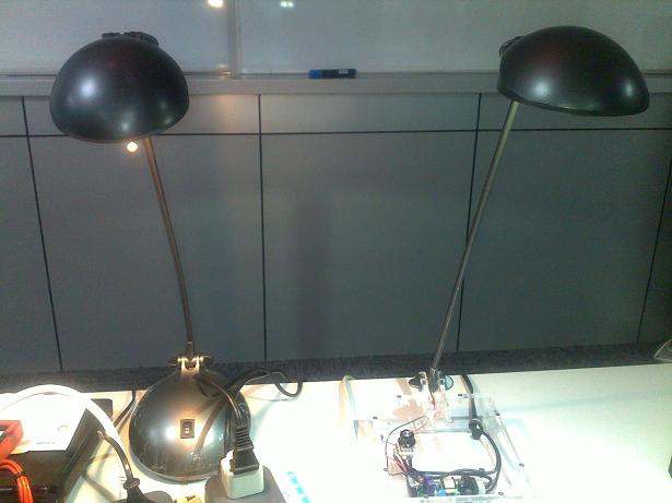 現場,Laurent為我們演示了用LED模塊代替鹵素臺燈在能效方面的差異,如下圖所示:可以看出,使用LED燈作臺燈的能耗僅相當于鹵素燈的1/4。