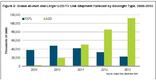 圖 3 所示為iSuppli 公司對40 英寸和更大尺寸液晶電視背光的單位出貨量預測,按背光類型細分,包括CCFL 和LED,涵蓋2009 到2013 年。