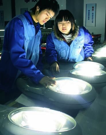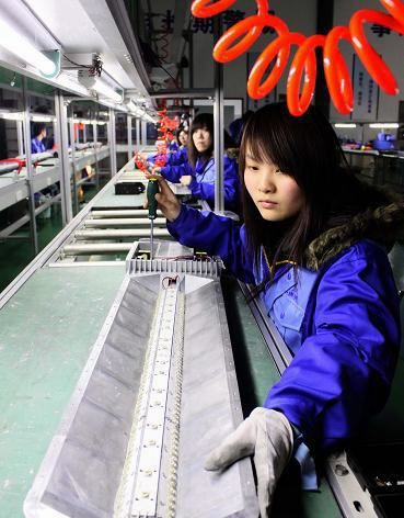 圖:天津工業(yè)大學(xué)海宇半導(dǎo)體照明產(chǎn)業(yè)化基地的員工在組裝LED照明燈
