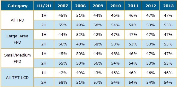 表一 2007-2013全球平面顯示產業上下半年市場份額