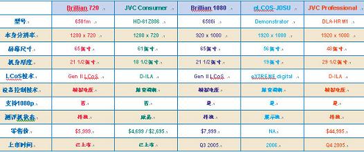 每個(gè)參與測(cè)評(píng)的制造商資料請(qǐng)?jiān)斠姾竺娴母咔咫娨曋圃焐探榻B,表1顯示了每種機(jī)型的基本信息,注意表中型號(hào)是以分辨率按字母順序排列的。JVCConsumer價(jià)格有兩個(gè)來源都列在表上,一個(gè)是制造商建議零售價(jià),另一個(gè)是我在市場(chǎng)上能找到的最低實(shí)際售價(jià),其它都將以表中所列價(jià)格即將在市面上發(fā)售。
