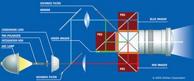 LCoS的基本原理是在液晶層后面用一個(gè)鏡子,光線從前面進(jìn)來后穿過液晶層,經(jīng)過鏡子反射再次穿過液晶層射到屏幕上。這需要稍微復(fù)雜一些的光學(xué)部件,但確實(shí)非常有用,它有幾個(gè)直接明顯的優(yōu)點(diǎn),如所有電子部件都在鏡子后面,完全在光路以外。在它后面有很大空間,這樣就可能達(dá)到難以置信的高分辨率,LCoS在所有顯示技術(shù)中分辨率最高。另外因光線兩次穿過液晶,可以達(dá)到很高對(duì)比度但依然非常薄,從而大大改善響應(yīng)時(shí)間減少拖影。我們將在第三部分討論LCoS的優(yōu)點(diǎn)和缺點(diǎn)。