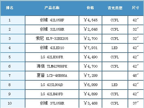 - 5月前10名消費者關注液晶電視產品中有6款為42英寸液晶電視,足見其主流地位的穩定。