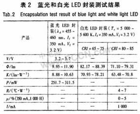 根據LED的光學結構及芯片、封裝材料的性能,建立了光學設計模型和軟件仿真手段,優化了封裝的光學結構設計。通過封裝工藝技術改進,減少了光的全反射,提高了產品的取光效率。改進導電膠的點膠工藝方式,并對裝片設備工裝結構與精度進行了改進,采用電熱隔離封裝結構和優化的熱沉設計,降低了器件熱阻,提高了產品散熱性能。采用等離子清洗工藝,改善了LED封裝界面結合及可靠性。針對照明應用對光源的光色特性的不同要求,研究暖白、日光白、冷白光LED顏色的影響因素:芯片參數、熒光粉性能、配方、用量,并通過改進熒光膠涂覆工藝,提高了功率LED光色參數的控制能力,生產出與照明色域規范對檔的產品。藍光和白光LED封裝測試結果見表2。表中:φ為光通量;K為光效;P為光功率;R為熱阻;μ為光衰;I為飽和電流。