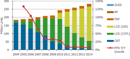 根據DisplaySearch最新一季「全球電視出貨調查研究報告」中指出,2010年全球電視出貨將超過2億4千2百萬臺,值得一提的是2009年的成長率僅2%,但預估今年成長率將達15%。不僅液晶電視市場成長力道強勁,出貨量較去年成長29%達到1億8千8百萬臺,等離子電視與傳統映像管電視在2010年的表現也比先前預期的好。以液晶電視來說,CCFL目前供應相當良好,但目前業界關心的是LED背光源使用率不斷增加的情形之下,快速的成長將造成供應鏈面臨吃緊的狀態。