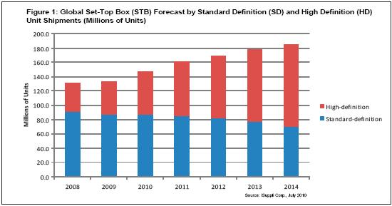 圖1:全球機(jī)頂盒出貨量預(yù)測(以百萬計(jì)),按標(biāo)清和高清細(xì)分。