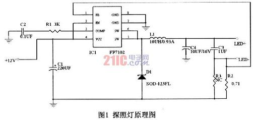 FP7102芯片設計的小型探照燈,所有元器件安放在1×2.7cm的板子上,制作完成后整個燈可以塞進直徑為3cm的管子里,管子長度可以任意長。為了達到應用板小型化,在此設計中使用FP7102芯片作為LED的驅動芯片,電路可靠度高、元件使用精簡、整體高效能運作,在應用上有很大的彈性空間,可滿足各種功率LED需要。