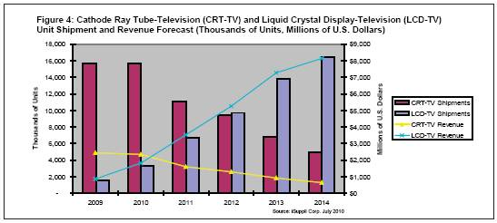 - 液晶電視出貨量將在2012年超過CRT電視