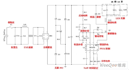 LED光源陣列設計為0.06W白光LED(SMT或草帽燈)24個串聯、12串并聯的方案,驅動288個小功率WLED,總功率18W。全電壓18WLED日光燈開關恒流源的設計電路如圖2所示,其各部分的功能如紅字所標注。圖中抗雷擊和EMI濾波組成EMC電路,饋流供電是利用已經做在芯片內部的整流二極管來實現的。