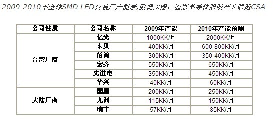 臺灣封裝第一大廠億光2010年LED TV背光源出貨大幅放量,已接到LG、三星、瑞軒等大廠訂單,初步規劃,SMD月產能將從10億顆倍增至20億顆。另一大廠東貝目前SMD月產能為4億顆,2010年也是鎖定擴充大尺寸背光用SMD封裝產能,SMD月產能將達到6億顆至8億顆,而宏齊以及佰鴻也都有擴產計劃。2010年臺廠SMD產能成長至少5成至1倍。