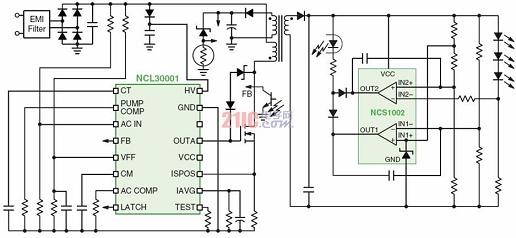 1)基于NCL30001的電流可調節(jié)恒流功率因數(shù)校正區(qū)域照明LED電源有些區(qū)域照明應用場合要求提供帶輸入功率因數(shù)校正的隔離型穩(wěn)壓輸出電壓。這些應用通常采用兩段式的電源轉換架構,其中的升壓功率因數(shù)校正(PFC)將交流輸入線路電壓轉換及預穩(wěn)壓為直流400V電壓,然后提供電壓給可以是任何適當拓撲結構的常規(guī)直流-直流(DC-DC)轉換器(功率不超過150W的應用中通常是反激轉換器)。