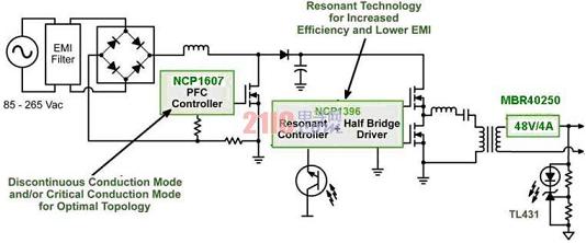 2)基于NCP1607和NCP1397的超高能效大功率LED街燈電源方案近年來,業(yè)界對超高能效的LED照明拓撲結構興趣日濃,期望在功率電平相對較低(<50W)時提供高于90%的能效,這個能效目標甚至比“能源之星”2.0版外部電源能效要求(功率不超過49W時能效高于87%)更高。要達到這樣高的能效,需要采用新的拓撲結構,如從反激拓撲結構轉向諧振半橋拓撲結構,從而充分發(fā)揮零電壓開關(ZVS)的優(yōu)勢。有利的是,安森美半導體早已著手開發(fā)能用于LED驅動電源的高能效半橋解決方案,如NCP1396及其升級版NCP1397高性能諧振模式控制器。NCP1397內置高端和低端驅動器,支持可調節(jié)及精確的最低頻率,提供極高能效,并具備多種故障保護特性。基于NCP1607PFC控制器和NCP1397雙電感加單電容(LLC)半橋諧振控制器的LED電源方案(見圖2)非常適合功率在50到300W范圍的高能效LED街道照明應用。[page]