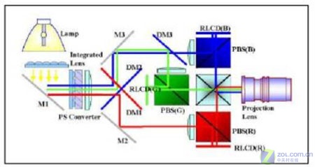 投影機技術基本顯影原理相仿,主要是由鹵素燈、氙氣燈等發光,集光至面板,將面板的影像經反射或透射投射出影像,再經過分光、合光系統,最后將影像投射到屏幕顯像。LCOS(LiquidCrystalonSilicon)是一種全新的數碼成像技術,它采用半導體CMOS集成電路芯片作為反射式LCD的基片,CMOS芯片上涂有薄薄的一層液晶硅,控制電路置于顯示裝置的后面,可以提高透光率,從而實現更大的光輸出和更高的分辨率。