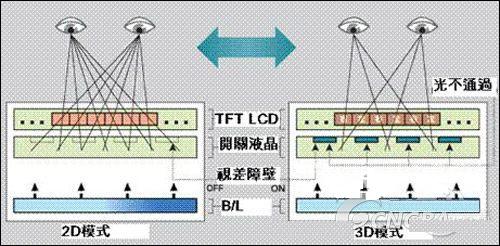 這些條紋寬幾十微米,通過它們的光就形成了垂直的細(xì)條柵模式,稱之為“視差障壁”。而該技術(shù)正是利用了安置在背光模塊及LCD面板間的視差障壁,在立體顯示模式下,應(yīng)該由左眼看到的圖像顯示在液晶屏上時(shí),不透明的條紋會遮擋右眼;同理,應(yīng)該由右眼看到的圖像顯示在液晶屏上時(shí),不透明的條紋會遮擋左眼,通過將左眼和右眼的可視畫面分開,使觀者看到3D影像。