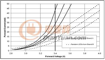由于LED伏安特性的離散性,不但不同廠家生產的同樣瓦數的LED伏安特性不一樣,就是同一廠家生產的同一型號的LED其伏安特性也是不同的。